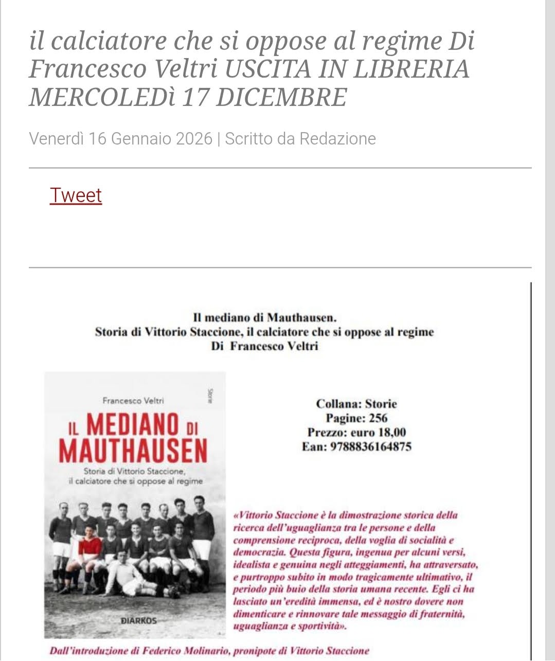 Dallo scudetto ad Auschwitz su TheTimes, quotidiano di New York