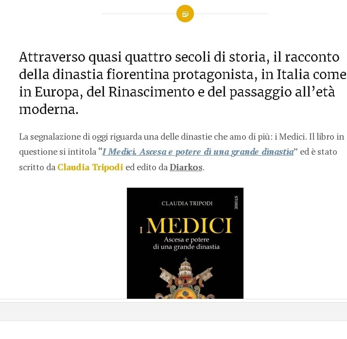 La segnalazione di oggi riguarda una delle dinastie che amo di più: i Medici. Il libro in questione si intitola “I Medici. Ascesa e potere di una grande dinastia” ed è stato scritto da Claudia Tripodi ed edito da Diarkos.