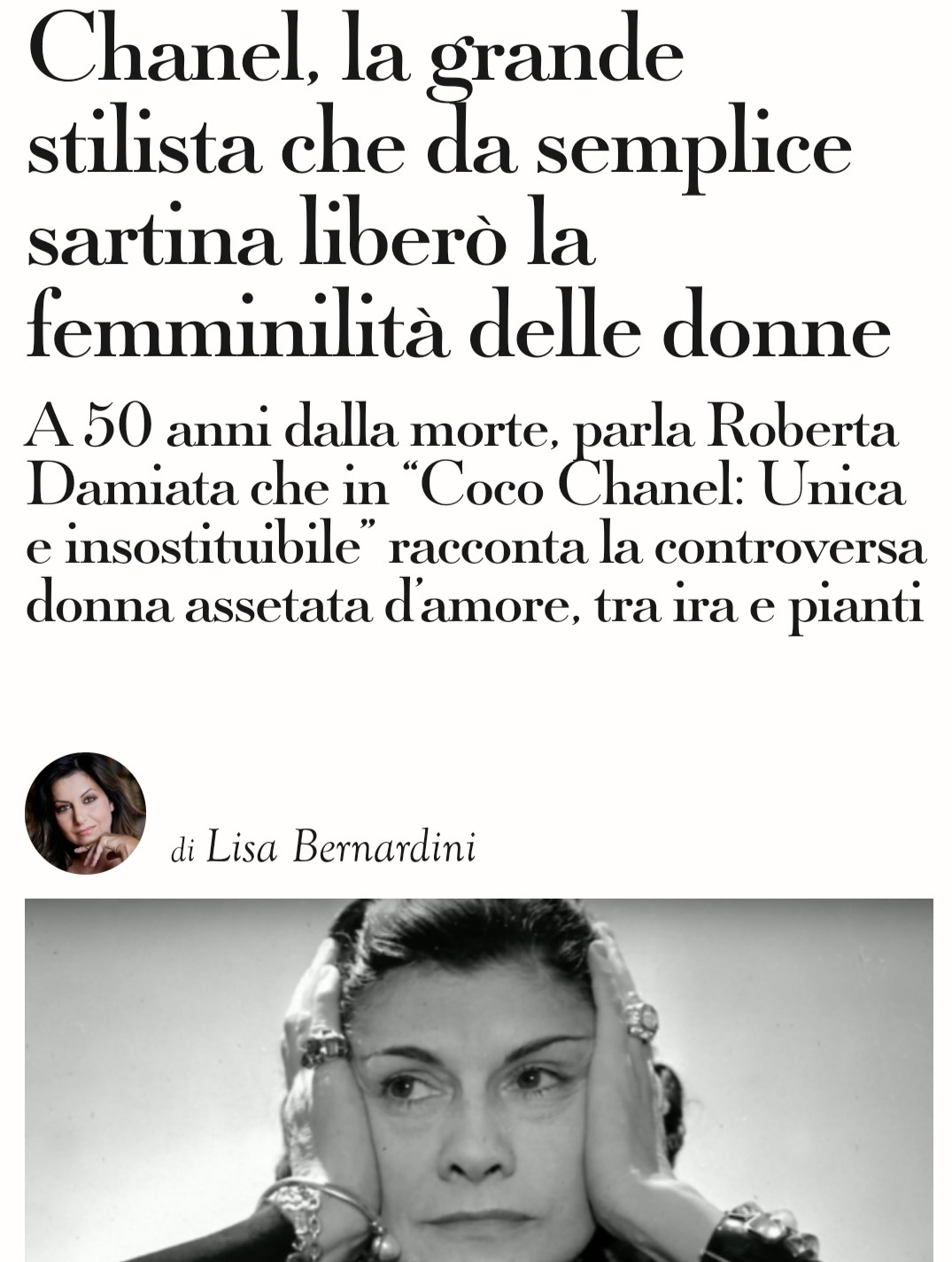 “In previsione della ricorrenza dei 50 anni dalla morte di Coco Chanel e insieme all’editore della Diakos, abbiamo deciso di rendere omaggio a questa grande donna. La biografia su di lei che ho scritto, recentissima, ha questa valenza. Ho cercato una chiave particolare per raccontare la sua esistenza, partendo dal lavoro di stilista per inserirmi poi nelle pieghe della sua vita; ho visitato meandri private assolutamente fondamentali per capire da dove nascono le creazioni che l’hanno resa famosa nel mondo. Quello che è venuto fuori, più che una biografia ortodossa, ritengo sia la storia vera di un iconico personaggio dalle mille sfaccettature. L’esistenza di Coco Chanel è quasi un romanzo, che a tratti si colora di tinte forti. Spero di essere riuscita in questa impresa e di aver fatto conoscere la controversa donna desiderosa d’amore che si nascondeva dietro il personaggio noto al grande pubblico”.
