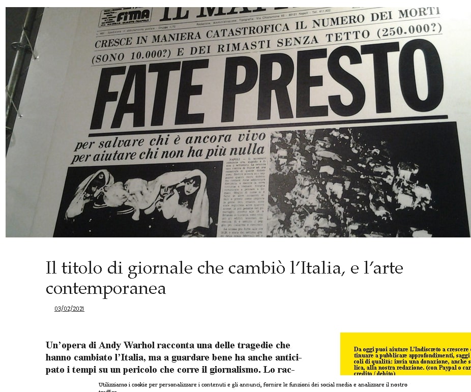 Link all'articolo: https://www.indiscreto.org/il-titolo-di-giornale-che-cambio-litalia-e-larte-contemporanea/?fbclid=IwAR1MnHuuwFtWW_wYm0NLWyjH8OSo2bHmMrPu8U56tIiZOqWtozBpDSC6giY