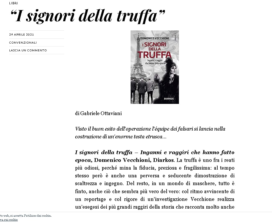 I signori della truffa – Inganni e raggiri che hanno fatto epoca, Domenico Vecchioni, Diarkos. La truffa è uno fra i reati più odiosi, perché mina la fiducia, preziosa e fragilissima: al tempo stesso però è anche una perversa e seducente dimostrazione di scaltrezza e ingegno. Del resto, in un mondo di maschere, tutto è finto, anche ciò che sembra più vero del vero: col ritmo avvincente di un reportage e col rigore di un’investigazione Vecchione realizza un’esegesi dei più grandi raggiri della storia che racconta molto anche della natura umana, intimamente portata all’autoconservazione, costi quel che costi. Da non perdere.