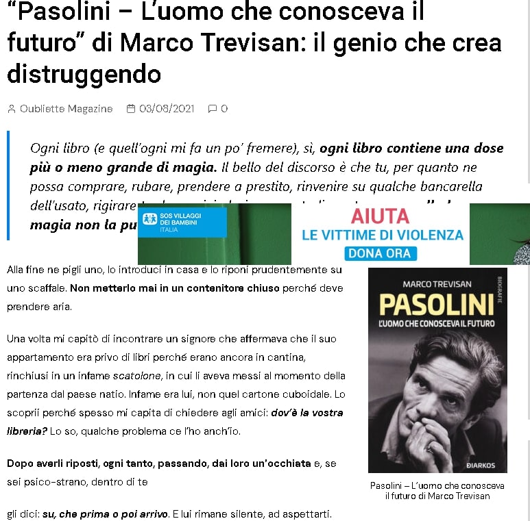 Intuisco, ma non ne sono certo: essendo lui per me un mito, ho paura che, leggendolo, egli si banalizzi. Compito del presente volume Pasolini – L’uomo che conosceva il futuro di Marco Trevisan è di svegliarmi da quel sonno che definirei mistico.