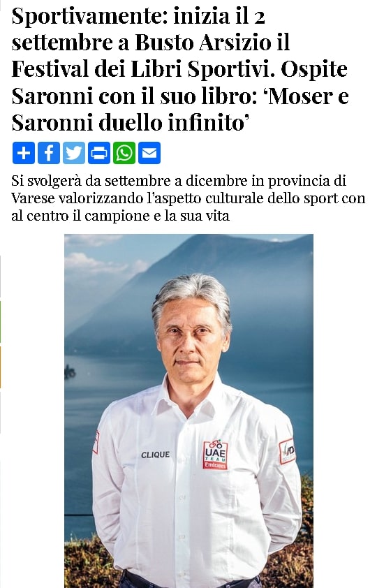 Il primo appuntamento è fissato a Busto Arsizio per il 2 settembre alle ore 20,45 nel Cortile del Palazzo Comunale con Beppe Saronni ed il suo libro ‘Moser e Saronni duello infinito’ che si inserisce nelle programmazioni del Comune per il centenario della Tre Valli.