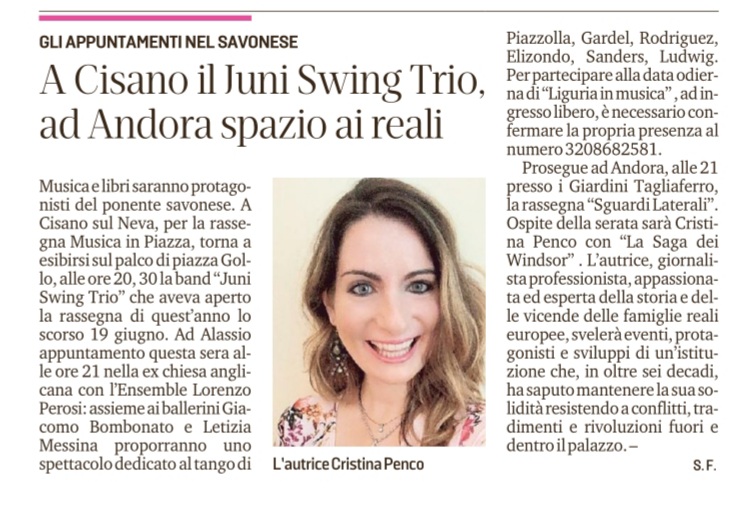 Cristina Penco presenterà il suo libro "La saga dei Windsor" questa sera alla rassegna Sguardi Laterali presso Palazzo Tagliaferro ore 21,00.