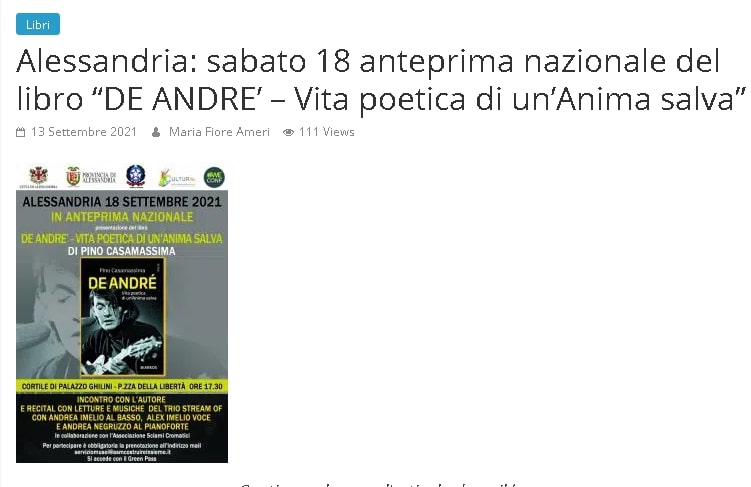 Ad Alessandria, l’Anteprima Nazionale del Libro “DE ANDRE’ – Vita poetica di un’Anima salva” di Pino Casamassima
