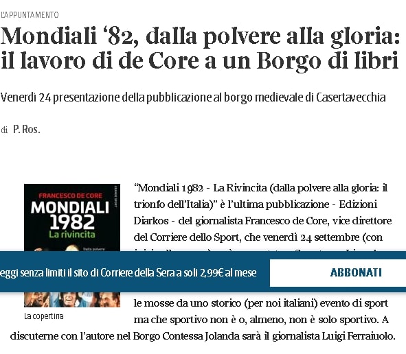 “Mondiali 1982 - La Rivincita (dalla polvere alla gloria: il trionfo dell’Italia)” è l’ultima pubblicazione - Edizioni Diarkos - del giornalista Francesco de Core, vice direttore del Corriere dello Sport, che venerdì 24 settembre (con inizio alle ore 19) sarà presentato a Casertavecchia nel corso della IV edizione di “Un Borgo di libri”, nell’ambito della rassegna “Settembre al Borgo”. Un libro che prende le mosse da uno storico (per noi italiani) evento di sport ma che sportivo non è o, almeno, non è solo sportivo. A discuterne con l’autore nel Borgo Contessa Jolanda sarà il giornalista Luigi Ferraiuolo.