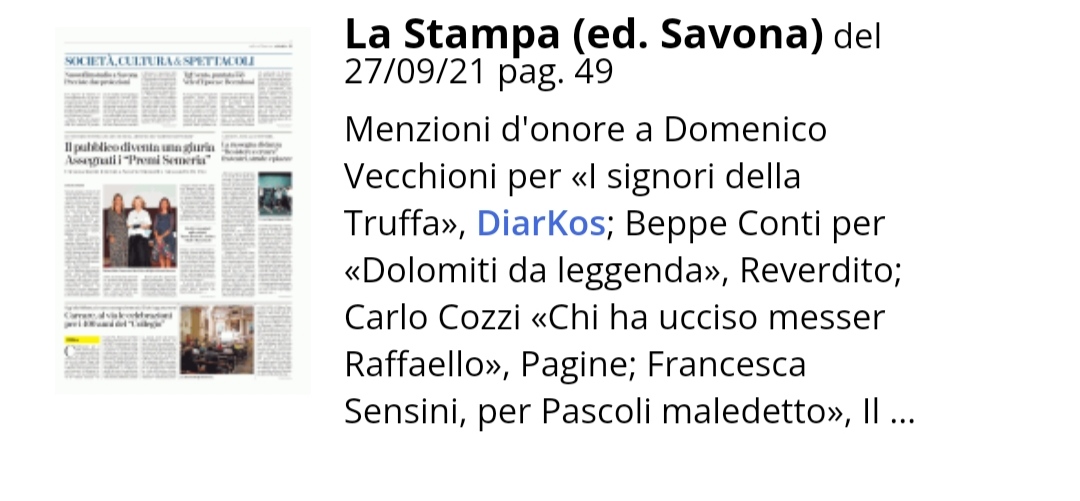 La Stampa Savona ricorda la Menzione d'onore assegnata a Domenico Vecchioni, autore de "I signori della truffa", in occasione del Premio Letterario Internazionale della città di Sanremo.