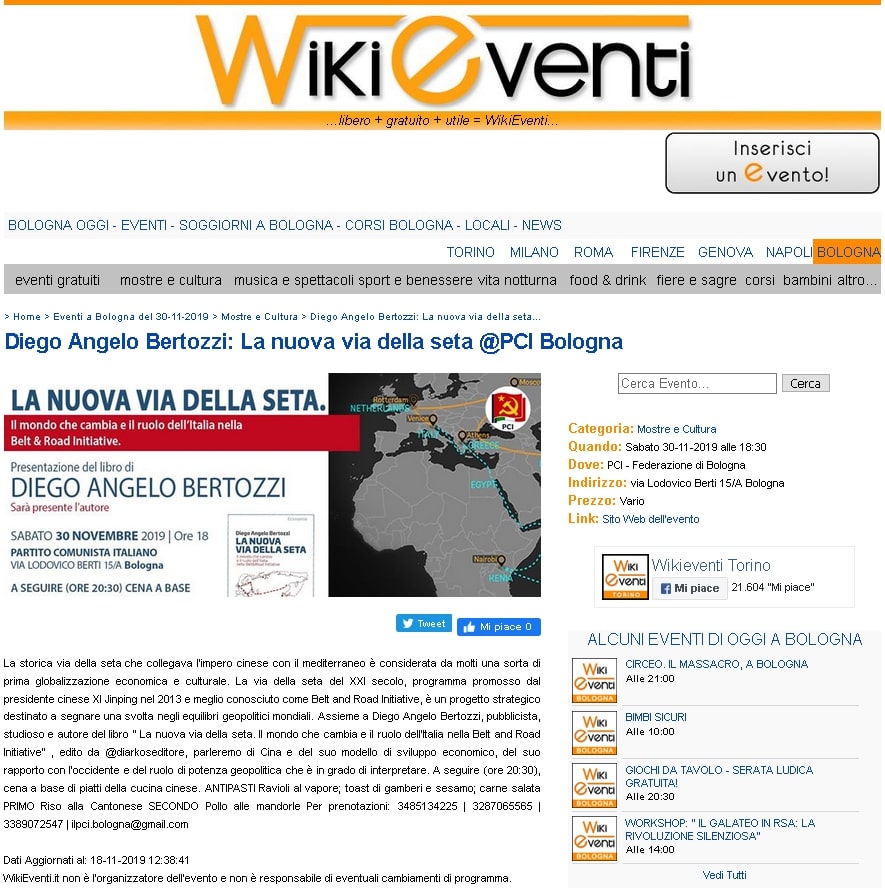 Wikieventi ricorda la presentazione del libro di Diego Angelo Bertozzi "La Nuova via della Seta" al PCI di Bologna.