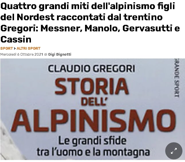 Un poker di grandi alpinisti tutti figli del Nordest: sono fra i protagonisti della Storia dell'alpinismo (Diarkos, 800 pagine, 23 euro) opera del giornalista-scrittore trentino Claudio Gregori che ripercorre tutte le grandi tappe ovvero «gli eventi cardine - spiega l'autore - come la scalata del Monte Bianco (datata 1786), quella del Cervino (1865), il K2 del Duca degli Abruzzi e di Desio, le Dolomiti e via via fino al free climbing e all'arrampicata sportiva di oggi».