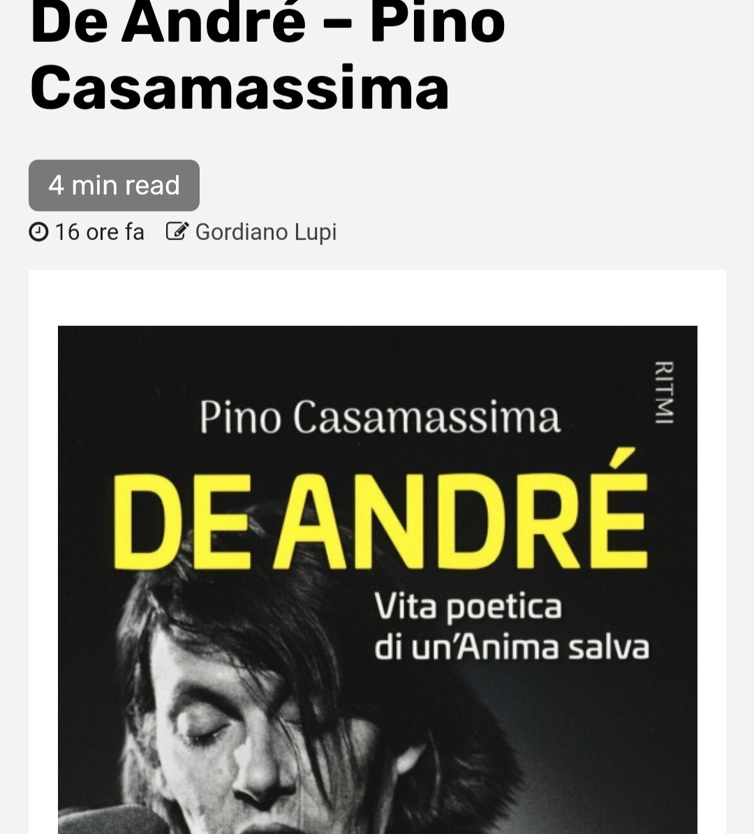 Fabrizio De André ha accompagnato la mia adolescenza inquieta. Era proprio il cantante giusto per farsi amare da uno come me. Scoperto per caso tra i dischi della Karim in un negozio della mia città che non esiste più (chi compra vinili?), ho consumato il solco de La guerra di Piero e La canzone di Marinella, per non parlare de La città vecchia, Preghiera in gennaio, Il pescatore. Ero così innamorato delle sue parole da odiare la PFM per aver osato contaminare in due album l’arte poetica di Fabrizio. Le note delle sue canzoni risuonavano nella mia camera di studente liceale per lunghi pomeriggi, ai tempi che si stava sdraiati sul letto o in poltrona per ascoltare concentrati la musica e le parole (leggendo i testi dell’album). Va da sé che i genitori disapprovavano, ma io lo sapevo che lui era un artista, superiore persino ai poeti che ci insegnavano a scuola, che pure amavo, ma non quanto il cantautore ligure. Canzoni tristi, disperate, malinconiche, di rabbia e d’amore, proprio quel che volevo sentir cantare, parole che sono rimaste nella mia modesta scrittura che ha avuto solo due maestri: De André e Pasolini, entrambi poeti, senza differenze. Storia di un impiegato è un disco che ho amato, ascoltato più volte, dal motivetto del maggio francese, al ballo mascherato, passando per il bombarolo, la prigione, l’ora d’aria da non spartire, per finire con la suadente Verranno a chiederti del nostro amore. Se so qualcosa di Cristo e dei Vangeli lo devo a Fabrizio e alla rilettura dei Vangeli apocrifi compiuta ne La buona novella, ma anche a Pasolini con il Vangelo secondo Matteo. E la mia poca religiosità, il mio scarso senso del sacro, è debitore assoluto del messaggio ascoltato in musica e al cinema. Edgar Lee Masters sarebbe rimasto un autore ignoto, depositato in uno scaffale polveroso, se De André non l’avesse messo in musica con le ballate scritte sulle lapidi di un paese con un cimitero in collina. Non avrei mai avuto la curiosità di conoscere Brassens se non avessi ascoltato Il gorilla e soprattutto Morire per delle idee, stesso discorso vale per Leonard Cohen e Bob Dylan. Non capisco la musica, non me ne intendo proprio, amo la poesia, la lirica, la sinfonia delle parole. De Andrè mi ha sempre dato tutto questo, con la sua attenzione verso i diseredati, i diversi, gli ultimi, con la sua anarchia compassionevole, con il suo voler essere artista puro, lontano da ogni meschino gioco politico. C’è chi mi ricorda che Fabrizio non è stato un marito e un padre esemplare, aveva tanti difetti, beveva troppo, non rispettava le regole. Tutto vero. Era un uomo, con i suoi limiti, ma un artista dev’essere giudicato per l’opera che ha prodotto, per i capolavori lasciati in eredità. Pino Casamassima, vent’anni dopo la prima pubblicazione del suo libro su De Andrè, lo riprende in mano per aggiornarlo e diffonderlo, grazie a un ottimo editore come Diarkos. Il libro è davvero eccellente, perché raccontando la vita e le opere di un cantante narra gli anni Sessanta – Novanta che abbiamo vissuto, il terrorismo, il perbenismo cattolico, il potere democristiano, l’impegno politico nella canzone, il Viet-Nam, la guerra fredda, la contestazione studentesca … Il ritratto che Casamassima compie di De Andrè fotografa tutta la sua ansia per il sociale, documenta il racconto dei vinti, dei falliti, compiuto con le stesse parole dell’artista, che aveva grande compassione per i drogati, gli sbandati, i suicidi, in una parola per tutti coloro che si erano lasciati sopraffare dalla vita. Un libro indispensabile per chi ama Fabrizio, anche se lo conosce bene, di gran lunga migliore rispetto alle tante biografie e saggi di varia natura che sono usciti in questi ultimi anni. Consigliato.
