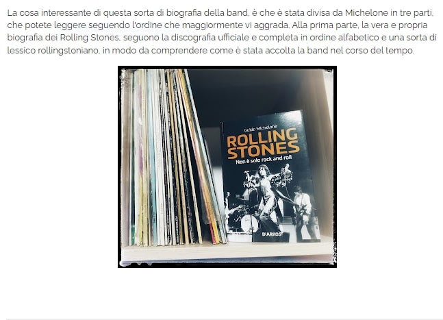 La cosa interessante di questa sorta di biografia della band, è che è stata divisa da Michelone in tre parti, che potete leggere seguendo l'ordine che maggiormente vi aggrada. Alla prima parte, la vera e propria biografia dei Rolling Stones, seguono la discografia ufficiale e completa in ordine alfabetico e una sorta di lessico rollingstoniano, in modo da comprendere come è stata accolta la band nel corso del tempo.