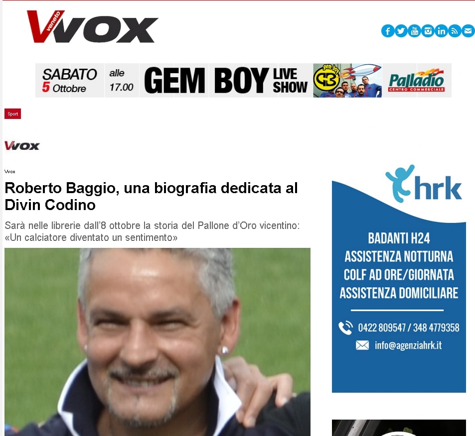 «Lui e il suo pallone. Roby lo portava persino in bagno, a letto e giocava tutto il giorno con quella sfera così perfetta. Una passione che andava oltre qualsiasi cosa: infortuni, incomprensioni, tatticismi, denaro». Sarà nelle librerie dall’8 ottobre la biografia di Roberto Baggio, Pallone d’Oro nel 1993, il campione di Caldogno, cresciuto nel Vicenza, dove ha esordito in C in prima squadra a soli 16 anni, amato da tutti, indipendentemente dalle maglie che ha indossato, dopo quella del Lane, Fiorentina, Juventus, Milan, Bologna, Inter e Brescia, squadre con cui ha vinto praticamente tutto. L’ unico nella storia del calcio italiano, vicecampione del mondo con la nazionale nel 1994, ad aver segnato in tre mondiali diversi. “Roberto Baggio. Il Divin Codino – Un calciatore diventato un sentimento” scritto dal giornalista Fabio Fagnani racconta di un campione, un fantasista, un artista del pallone, tra i più forti di tutti i tempi, che dopo aver chiuso la sua carriera calcistica ha lasciato un vuoto che ancora si avverte, a livello sportivo e umano. Il 16 maggio 2004 giocò la sua ultima partita da professionista, con la maglia del Brescia. Da quel giorno, la fantasia applicata al mondo del calcio ha perso uno dei massimi protagonisti a livello mondiale. E se alle vittorie ci si può anche abituare, vedi Messi e Ronaldo, dei sentimenti si avverte maledettamente la mancanza. Sì, perché il Divin Codino, prima che un calciatore, ha rappresentato un sentimento: la voglia di non smettere mai di considerare quella palla che rotola un gioco, con la quale è necessario divertirsi, senza scendere a troppi compromessi tattici o esistenziali.