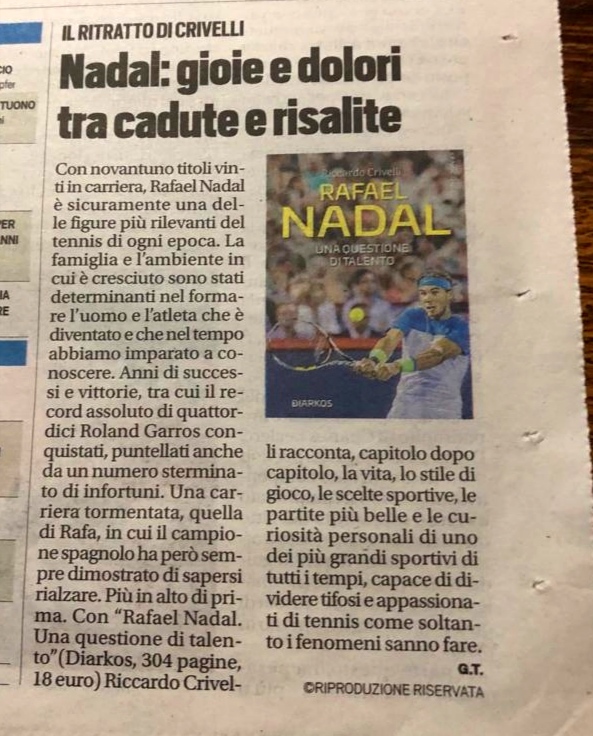 Nadal: gioie e dolori tra cadute e risalite Il nuovo libro di Riccardo Crivelli dedicato al famoso tennista su Tuttosport di sabato 26 novembre