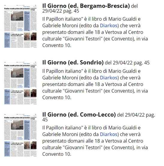 Il Giorno ricorda la presentazione di domani del libro di Gabriele Moroni "Il papillon italiano", che si terrà presso C. Culturale G. Testori (ex Convento) · Vertova · BG