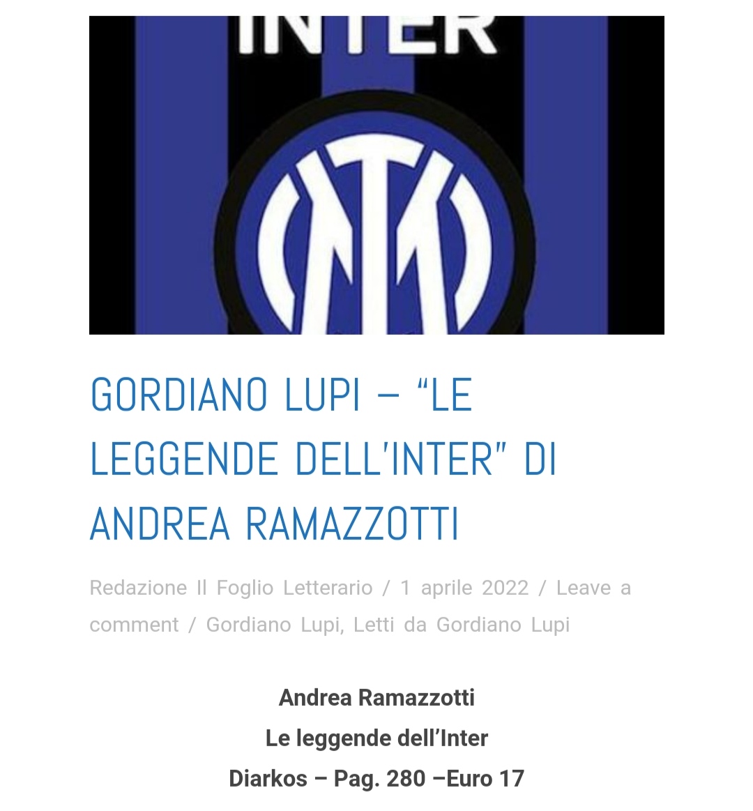 GORDIANO LUPI per Il Foglio Letterario – “LE LEGGENDE DELL’INTER” DI ANDREA RAMAZZOTTI