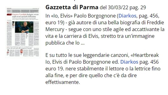 «Io, Elvis» Paolo Borgognone su Gazzetta di Parma
