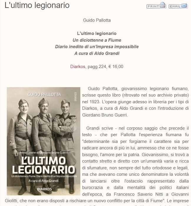 L'ultimo legionario Un diciottenne a Fiume Diario inedito di un'impresa impossibile A cura di Aldo Grandi su Archivio Storico