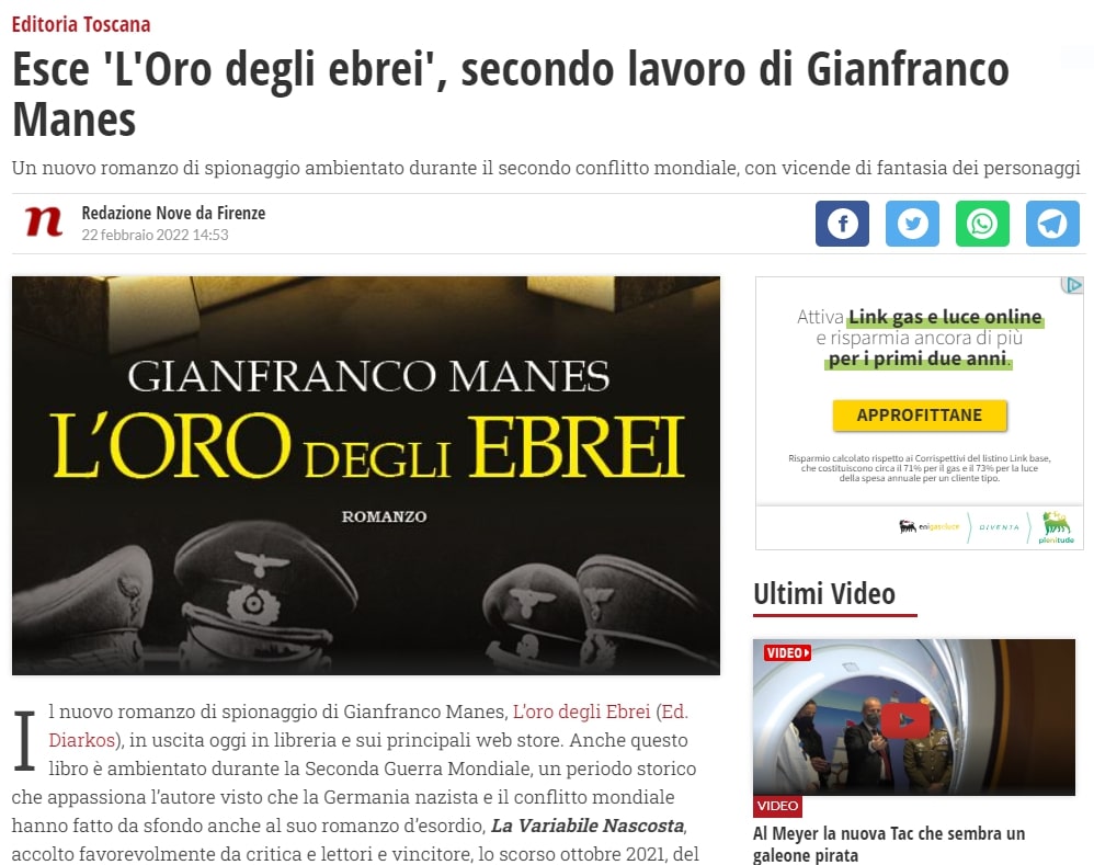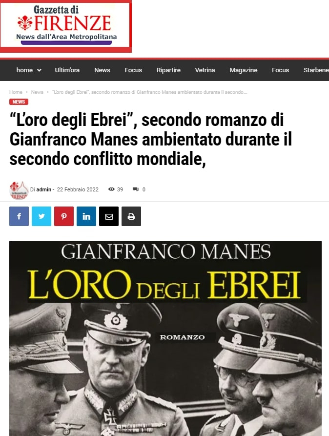 “L’oro degli Ebrei”, secondo romanzo di Gianfranco Manes ambientato durante il secondo conflitto mondiale- Gazzetta di Firenze