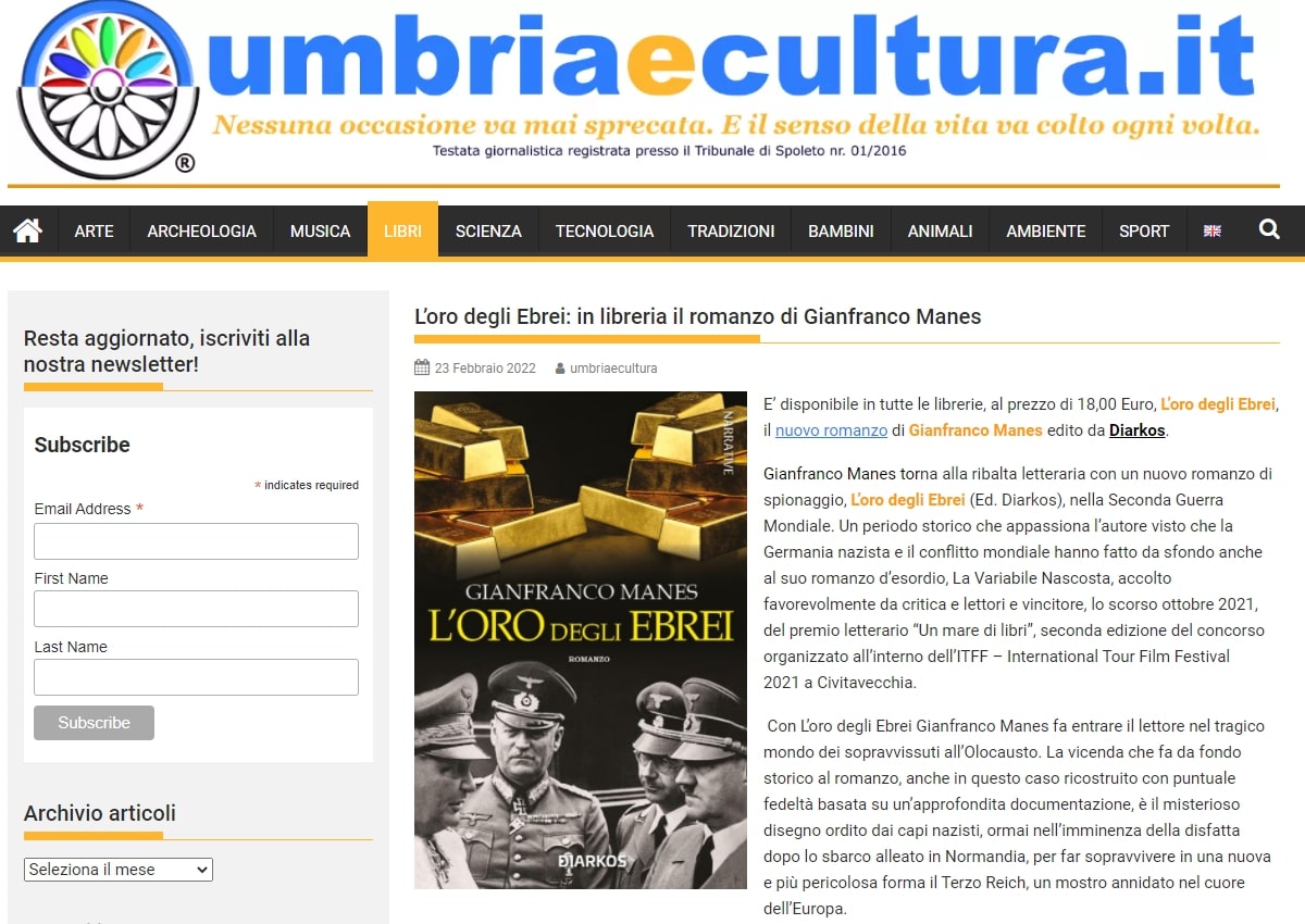 L’oro degli Ebrei: in libreria il romanzo di Gianfranco Manes - Umbria e cultura