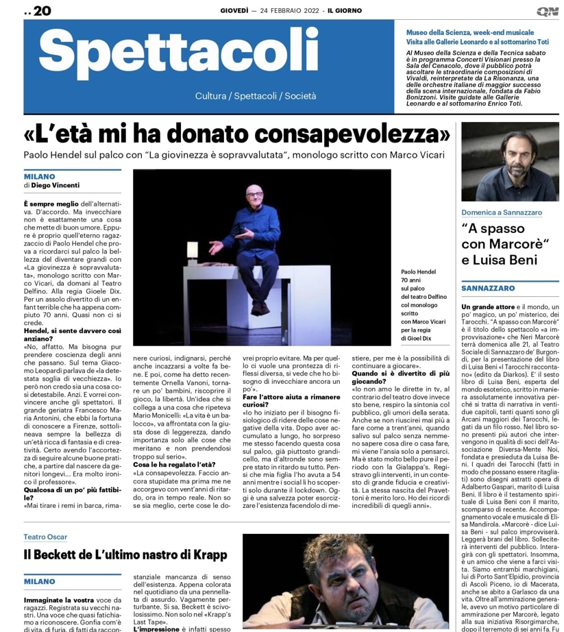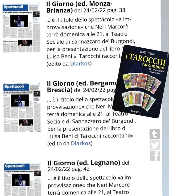 Il Giorno annuncia la presentazione del libro di Luisa Beni "I tarocchi raccontano", nell'ambito dello spettacolo "A spasso con Marcore'" , prevista per domenica 27 febbraio ore 21,00 a Sannazaro De' Burgondi (PV)
