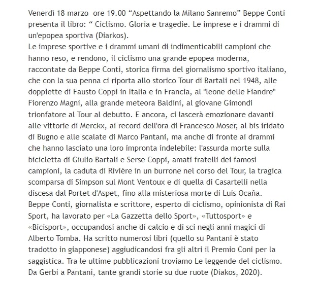 Beppe Conti presenta “ Ciclismo. Gloria e tragedie. Le imprese e i drammi di un'epopea sportiva"