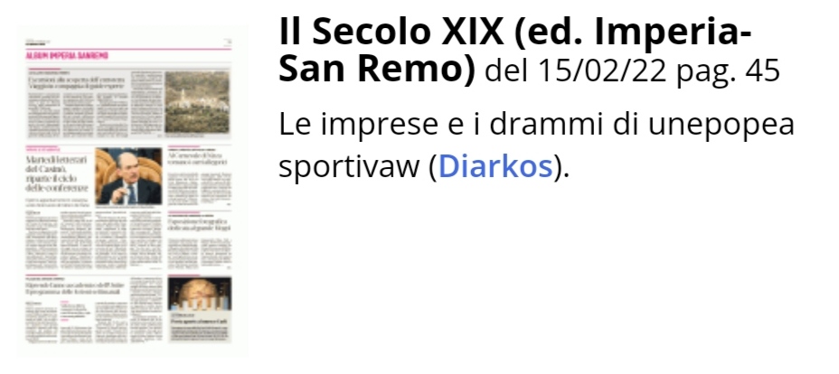 Anche Il Secolo XIX (ed. Imperia-San Remo) annuncia l'inizio dei martedì letterari del casinò di Sanremo, durante la quale sarà presentato "Ciclismo, Gloria e tragedie. Le imprese e i drammi di un'epopea sportiva" di Beppe Conti.