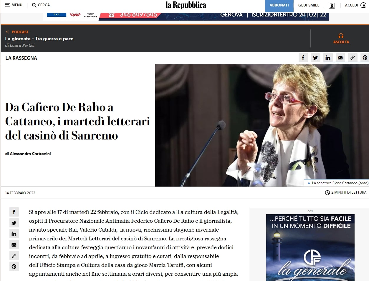 Da Cafiero De Raho a Cattaneo, i martedì letterari del casinò di Sanremo su La Repubblica