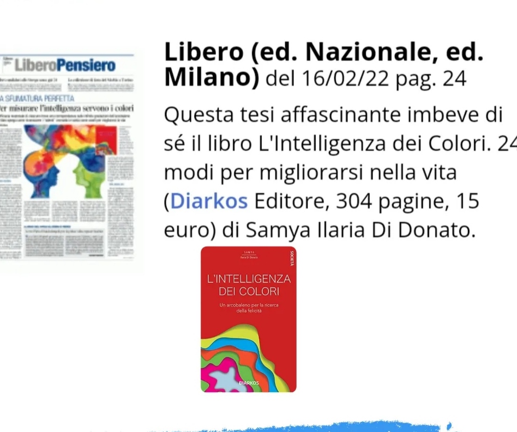 "L'intelligenza dei colori". Il libro si Samya di Donato oggi su Libero Quotidiano