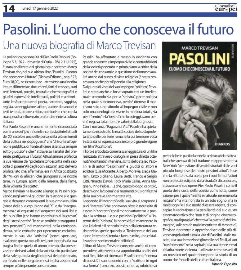 Pasolini. L’uomo che conosceva il futuro. Una nuova biografia di MarcoTrevisan sul nuovo numero di Giornalisti Europei