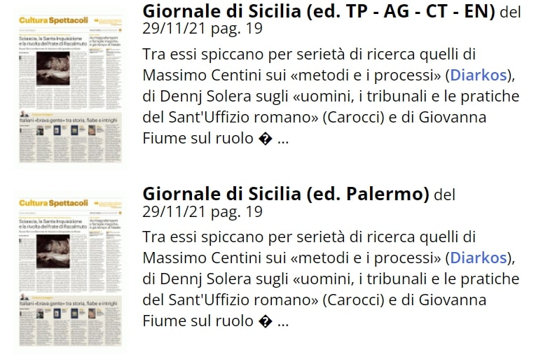 STORIA DELL’INQUISIZIONE MASSIMO CENTINI. Si parla del libro oggi sul Giornale di Sicilia
