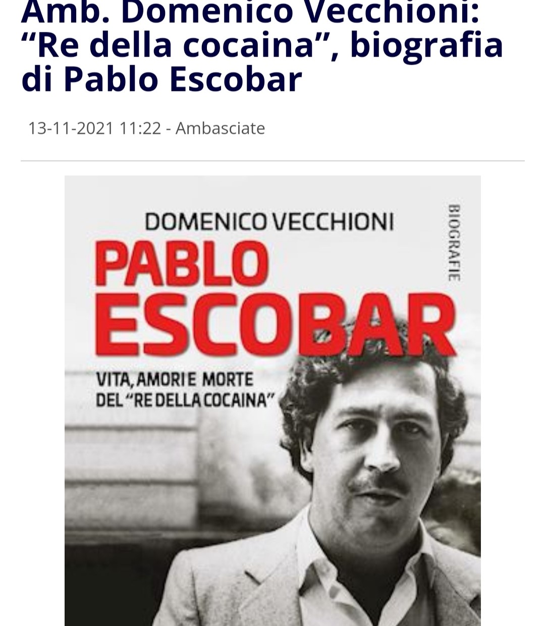 AMB. DOMENICO VECCHIONI: “RE DELLA COCAINA”, BIOGRAFIA DI PABLO ESCOBAR su Giornale Diplomatico