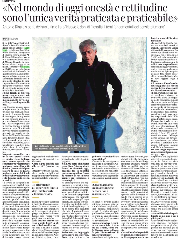 Antonio Rinaldis parla del suo ultimo libro "Nuove lezioni di filosofia. I temi fondamentali del pensiero umano" su La Sentinella del Canavese a pag. 15