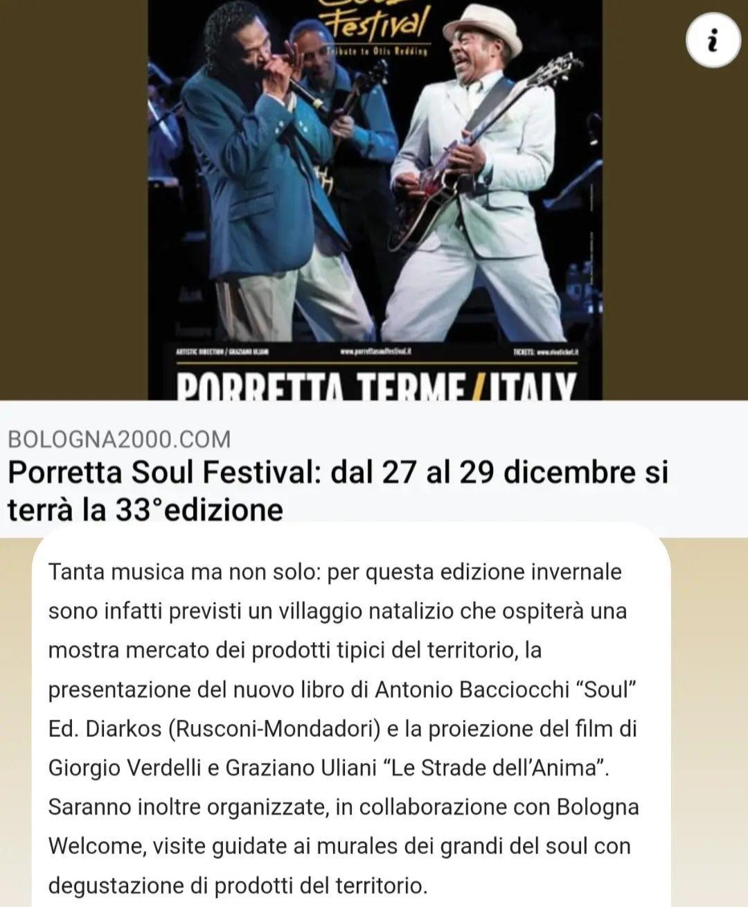 Porretta Soul Festival: dal 27 al 29 dicembre si terrà la 33°edizione- Al Festival ci sarà la presentazione di SOUL di Antonio Bacciocchi