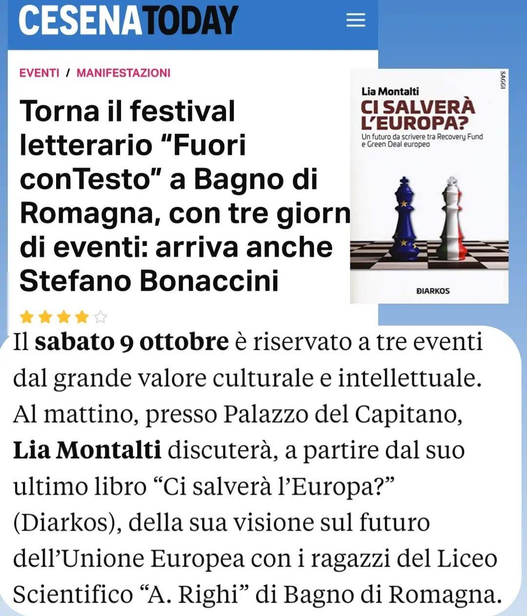 Torna il festival letterario “Fuori conTesto” a Bagno di Romagna, con tre giorni di eventi: arriva anche Stefano Bonaccini- Presentazione del libro di Lia Montalti "Ci salverà l'Europa?" su Cesena Today