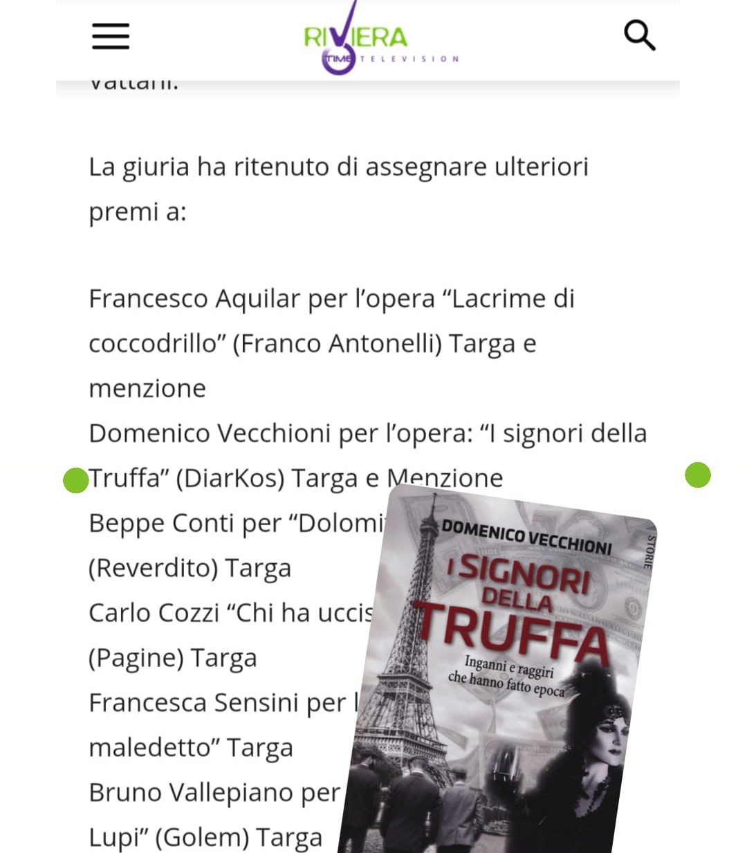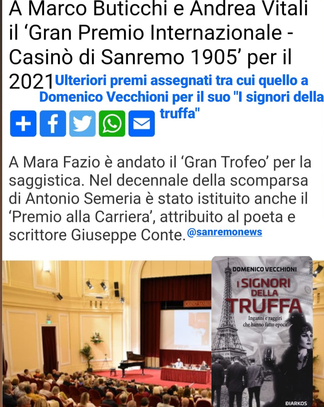 ‘Gran Premio Internazionale - Casinò di Sanremo 1905’: premiato anche Domenico Vecchioni per l’opera ‘I signori della Truffa’ su SanremoNews.it