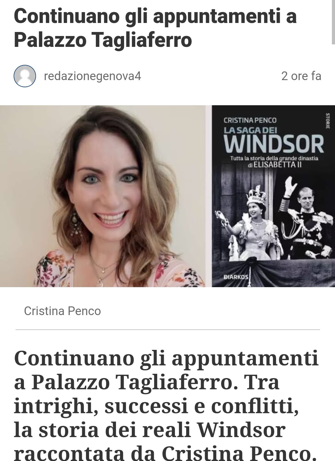 Continuano gli appuntamenti a Palazzo Tagliaferro.Tra intrighi, successi e conflitti, la storia dei reali Windsor raccontata da Cristina Penco su Liguria Notizie