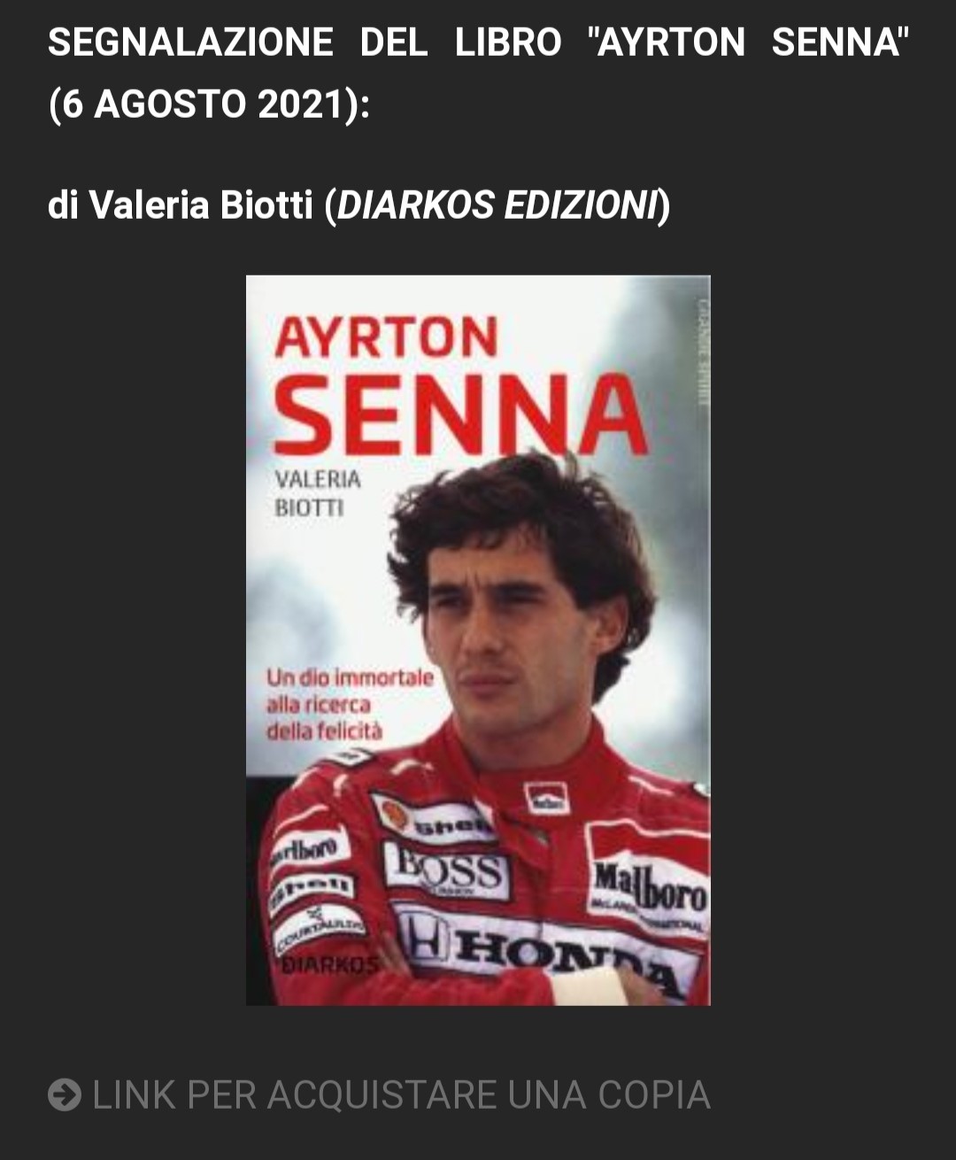 SEGNALAZIONE DEL LIBRO "AYRTON SENNA" (6 AGOSTO 2021): di Valeria Biotti (DIARKOS EDIZIONI)