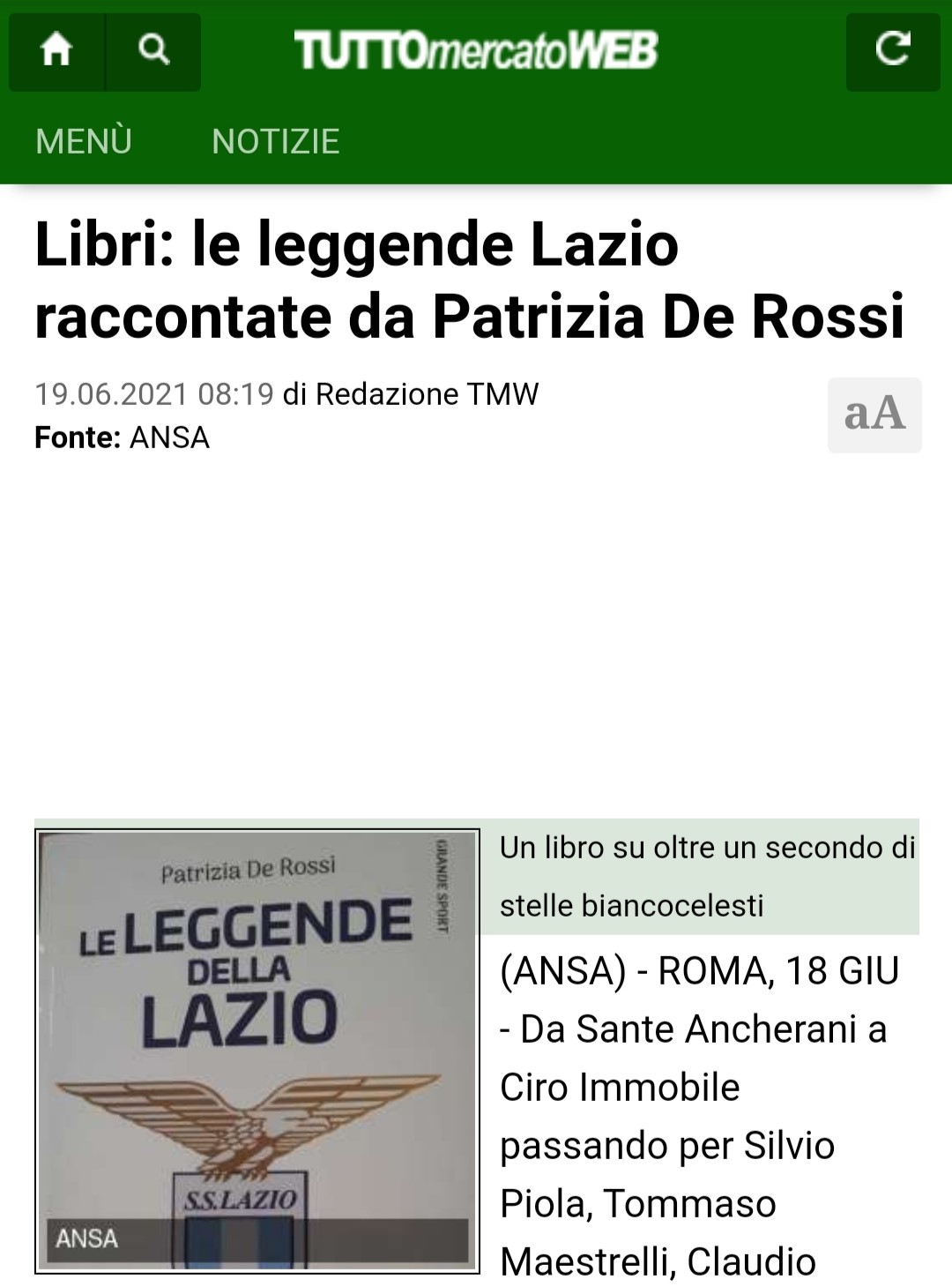 "Le leggende della Lazio" di Patrizia de Rossi su La Sicilia del 21/06/21 pag. 14