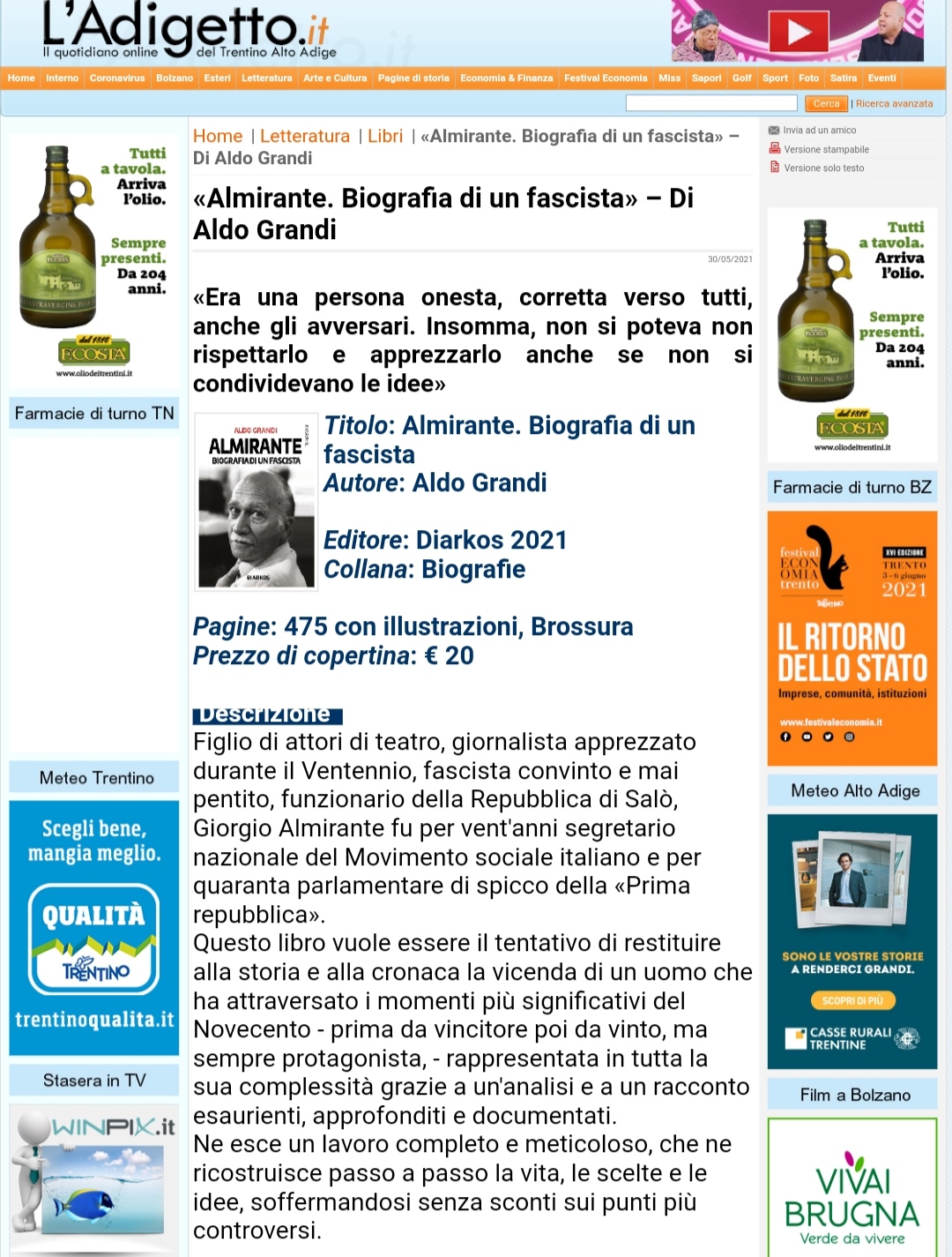 «Almirante. Biografia di un fascista» – Di Aldo Grandi su L'Adigetto