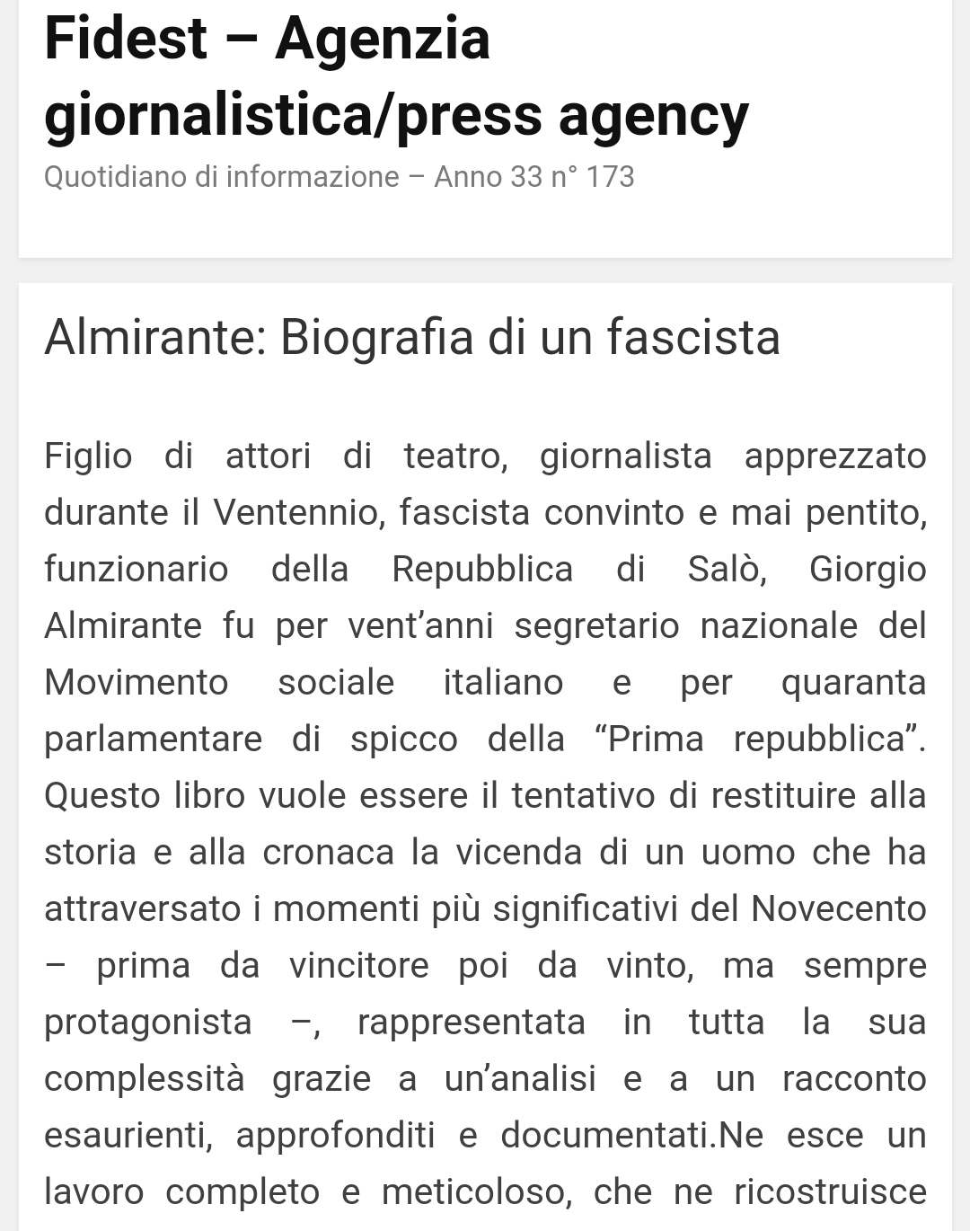 Almirante: Biografia di un fascista su Fidest- Agenzia giornalistica