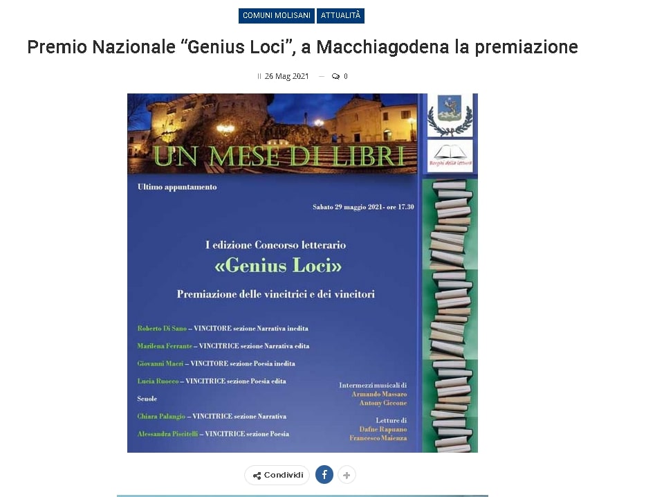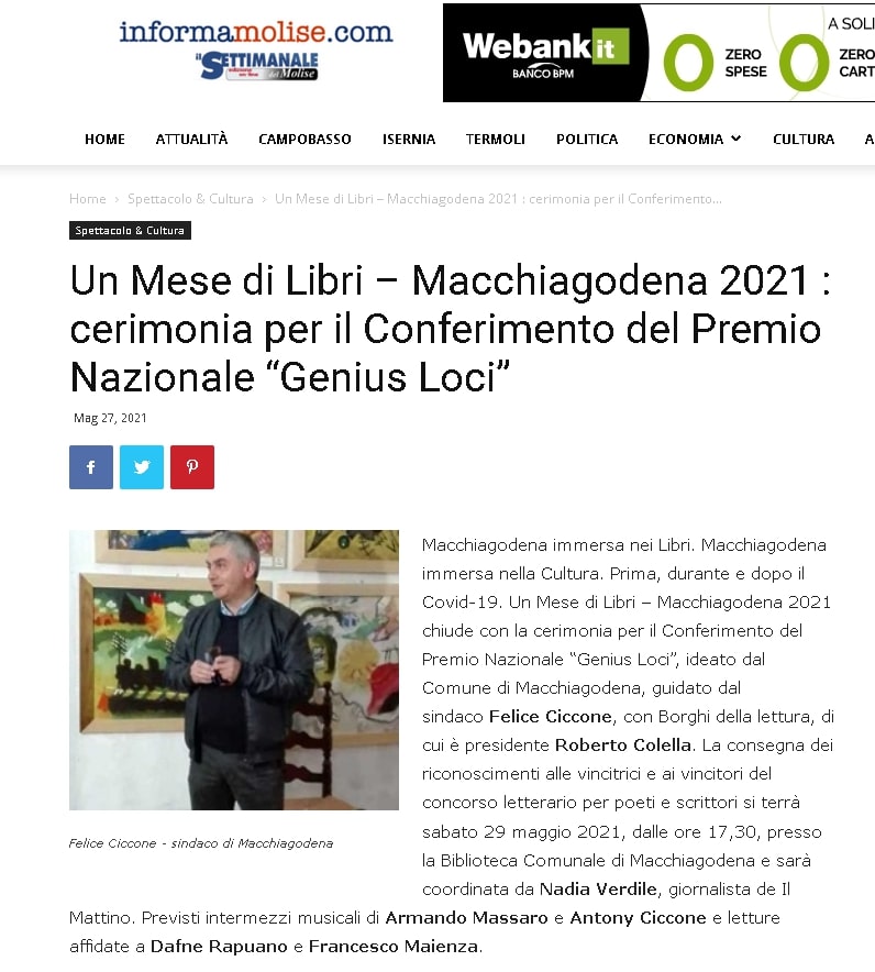 Un Mese di Libri – Macchiagodena 2021 : cerimonia per il Conferimento del Premio Nazionale “Genius Loci” su Informa Molise