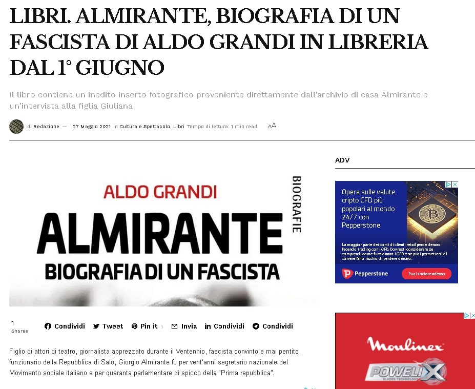 LIBRI. ALMIRANTE, BIOGRAFIA DI UN FASCISTA DI ALDO GRANDI IN LIBRERIA DAL 1° GIUGNO su Marsica Web