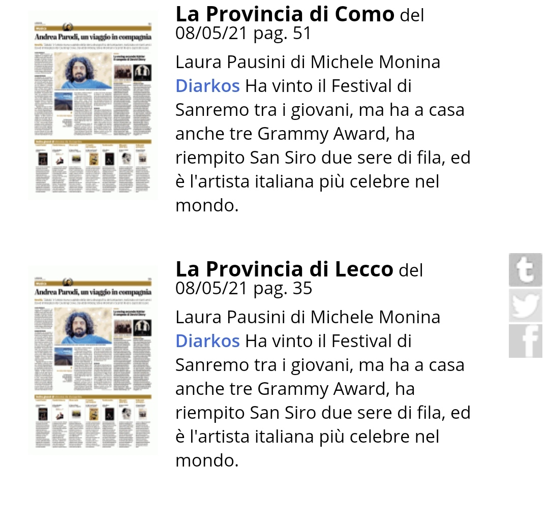 "Laura Pausini. Tutta una vita" di Michele Monina su La Provincia di Como e La Provincia di Lecco dell' 8/05/2021