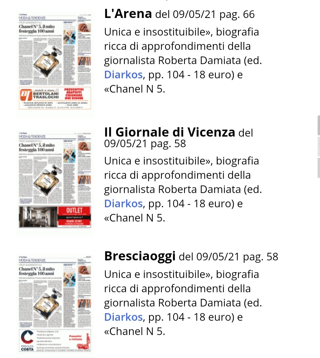 I cento anni di Coco Chanel. Il libro di Roberta Damiata "Coco Chanel" su L’Arena, Il Giornale d Vicenza, BresciaOggi del 09/05/2021