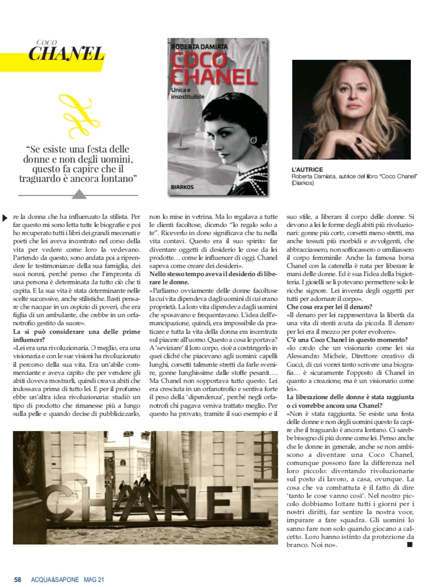 CHANEL E LA LIBERAZIONE DELLE DONNE. Il libro di Roberta Damiata sulla rivista Acqua e Sapone di maggio 2021