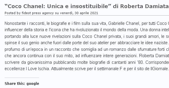 “Coco Chanel: Unica e insostituibile” di Roberta Damiata su Fidest- Agenzia di Stampa