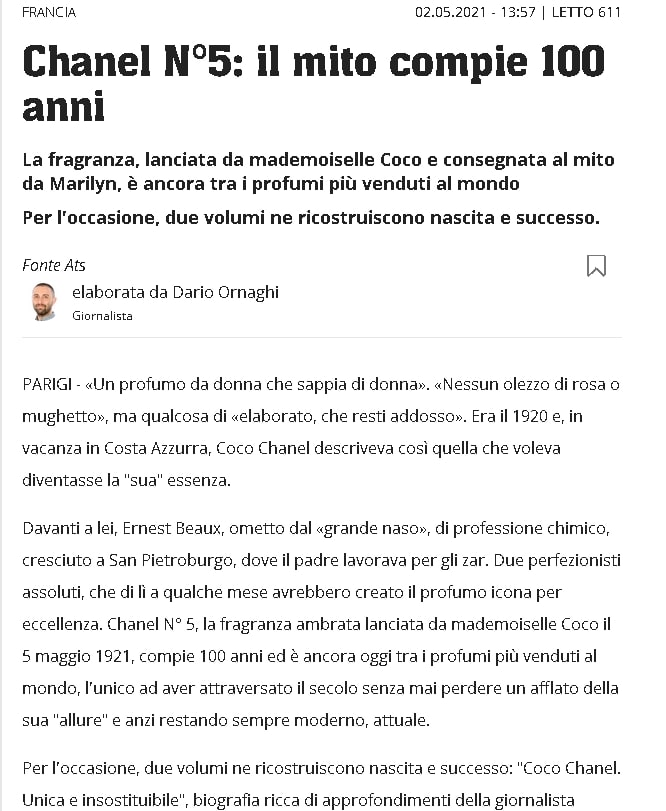 Chanel N°5: il mito compie 100 anni. "Coco Chanel. Unica e insostituibile" su Il Portale del Ticino