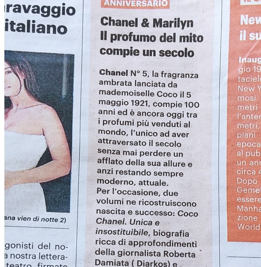 Chanel e Marilyn. Il profumo del mito compie un secolo su Il Resto del Carlino del 03/05/21 pag. 29