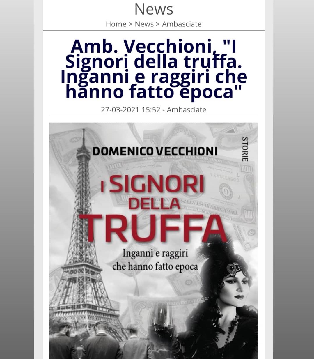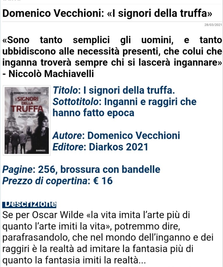Amb. Vecchioni, "I Signori della truffa. Inganni e raggiri che hanno fatto epoca" su Giornale Diplomatico