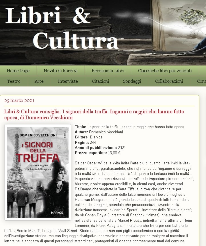 Libri & Cultura consiglia: I signori della truffa. Inganni e raggiri che hanno fatto epoca, di Domenico Vecchioni